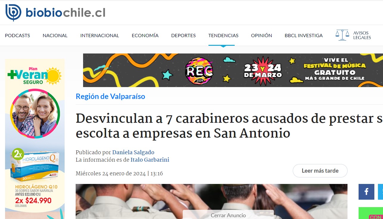 «La Prefectura de Carabineros de San Antonio, en la región de Valparaíso, desvinculó a siete funcionarios policiales, acusados de prestar servicios como escoltas a empresas privadas fuera de horario laboral.